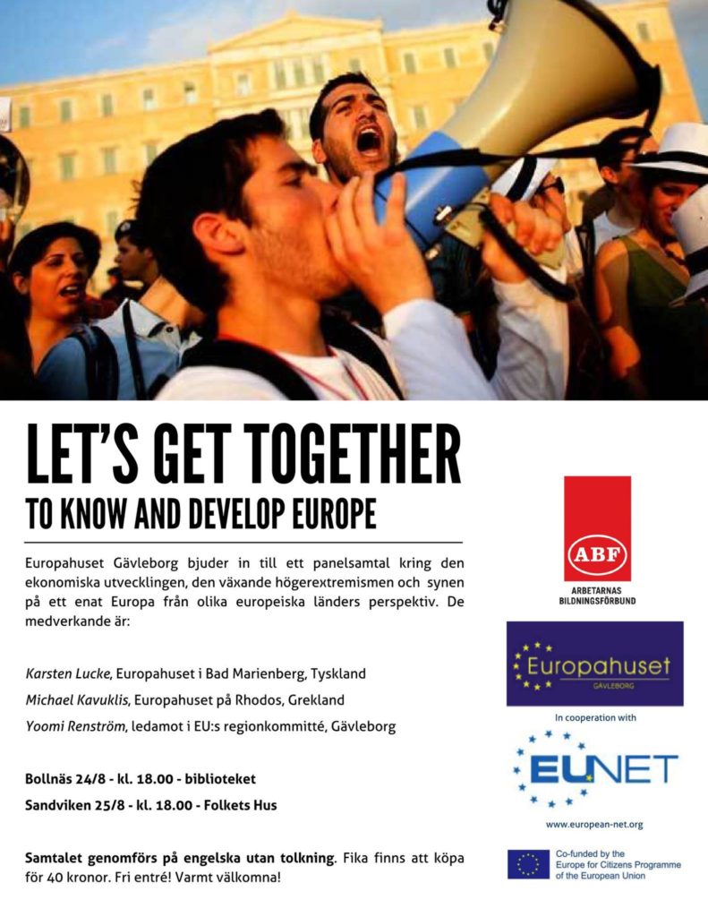 10680024_481734125318201_7977448843393478704_oΤο Σπίτι της Ευρώπης στο Galveborg της Σουηδίας, διοργανώνει συζητήσεις πάνω στις τάσεις για την οικονομική ανάπτυξη, την αύξηση του εξτρεμισμού και πως αντιλαμβάνονται διαφορετικές χώρες την ενωμένη Ευρώπη, στις 24 και 25 Αυγούστου, 2015.