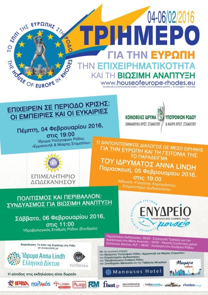 Το Τριήμερο για την Ευρώπη, την Επιχειρηματικότητα και τη Βιώσιμη Ανάπτυξη, που διοργανώνει το Σπίτι της Ευρώπης στη Ρόδο, 04-06/02/2016, ξεκινά με την ημερίδα «Επιχειρείν σε περίοδο κρίσης: Οι εμπειρίες […]